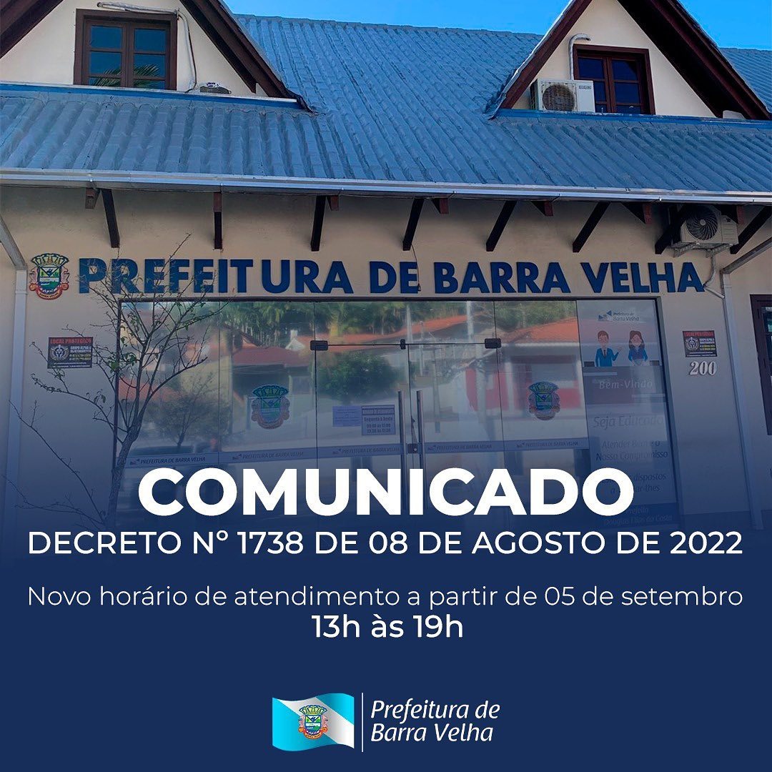 Conforme já comunicado, a partir de hoje (05) a Prefeitura Municipal de Barra Velha estará atendendo em novo horário, das 13h às 19h.