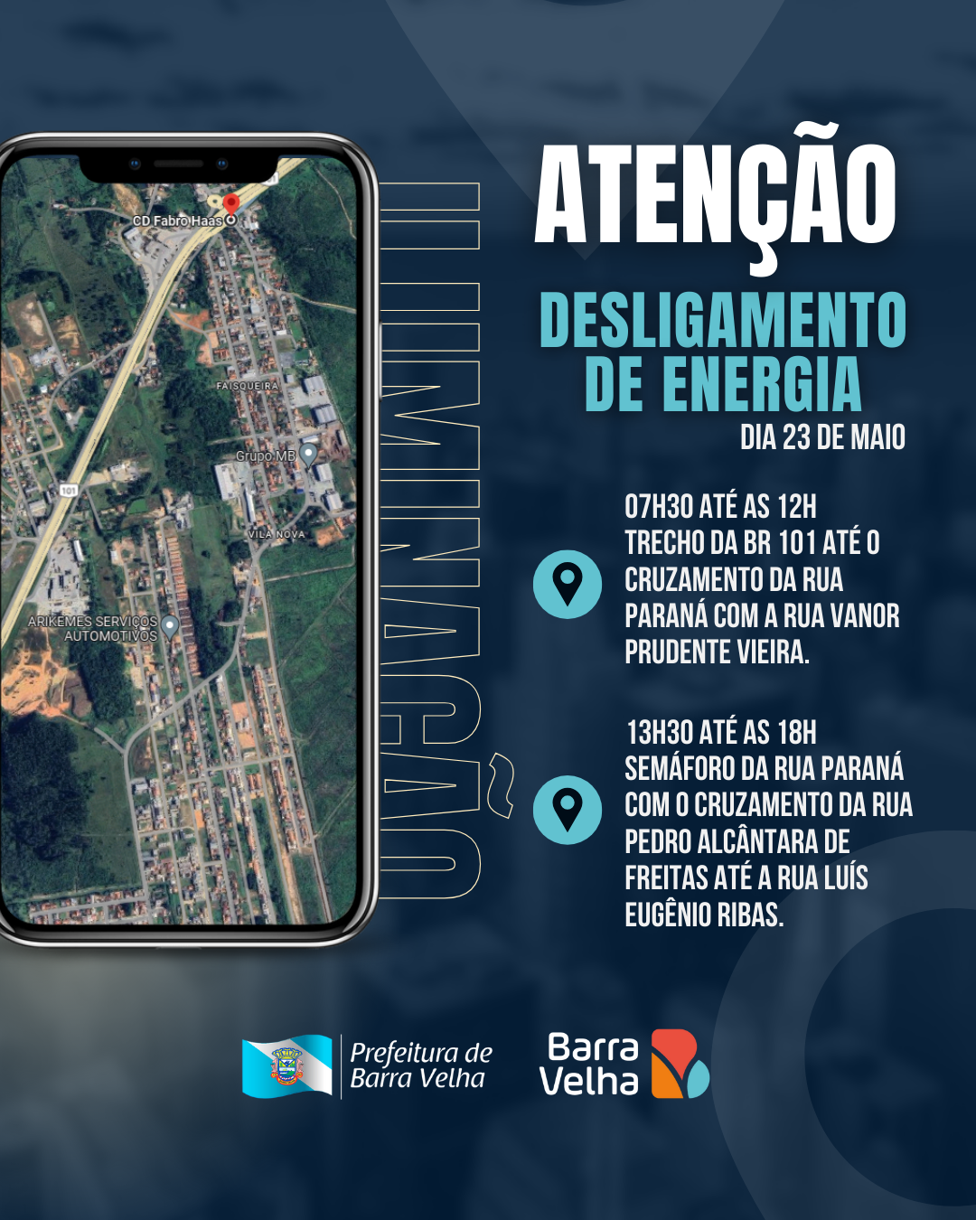 A Prefeitura de Barra Velha informa que na próxima quinta-feira, dia 23, haverá um desligamento de energia para a finalização das melhorias na Rua Paraná.