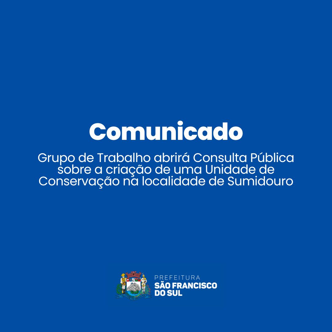 A Prefeitura de São Francisco do Sul, por meio da Secretaria de Meio Ambiente comunica que o Grupo de Trabalho instituído pelo Decreto nº 4.563, de 26 de março de 2024, abrirá a consulta pública sobre a criação de uma Unidade de Conservação na localidade de Sumidouro, na Praia do Capri, entre os dias 16 de dezembro de 2024 e 16 de janeiro de 2025