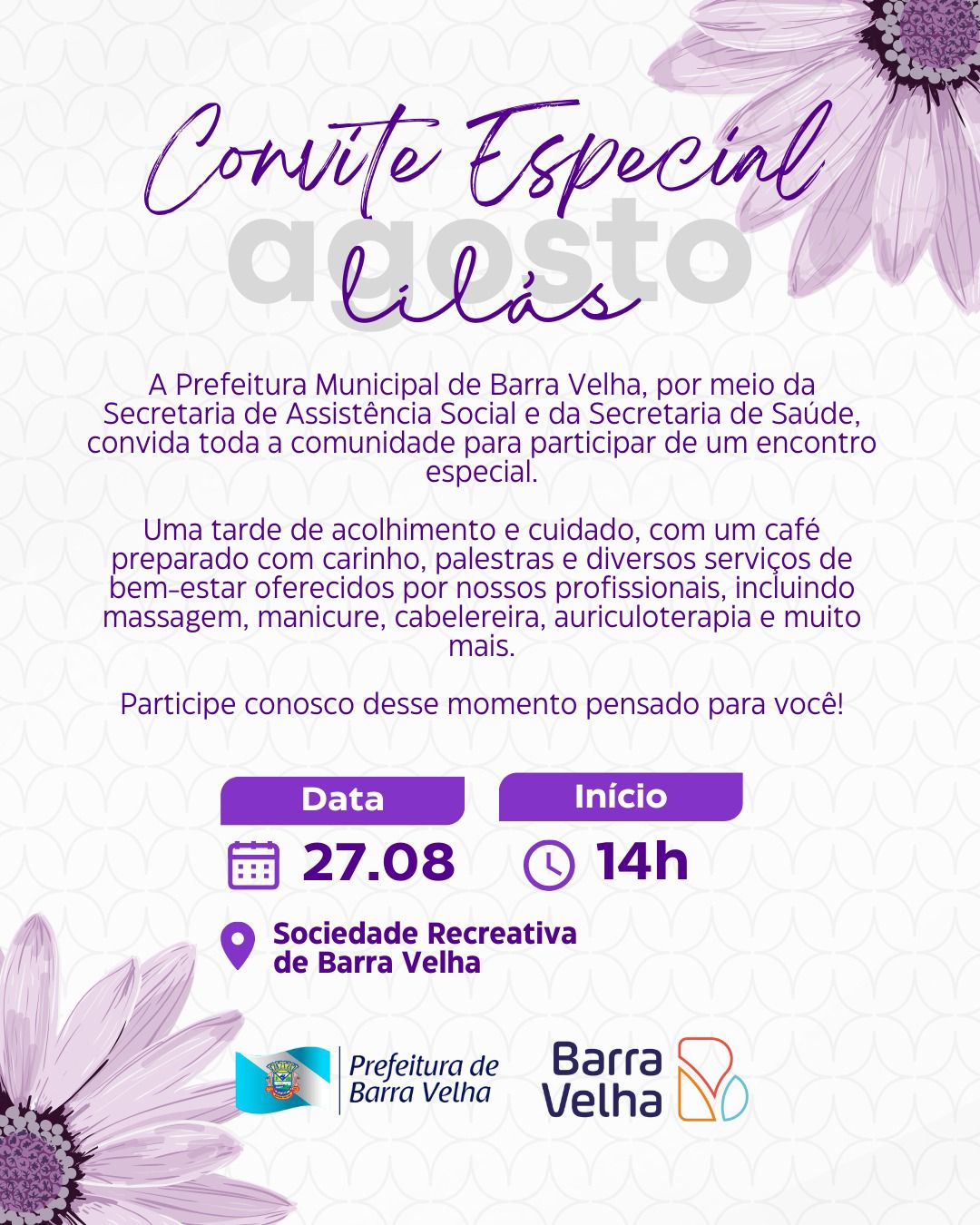 Em alusão ao Agosto Lilás, mês dedicado à conscientização pelo fim da violência contra a mulher, a Prefeitura de Barra Velha, por meio da Secretaria de Assistência Social e do CREAS, em parceria com a Secretaria de Saúde, promoverá um evento especial voltado às mulheres do município.