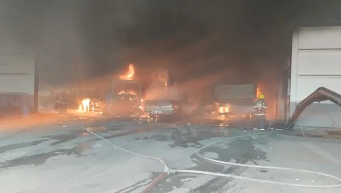 Chamas atingiram dois mil metros quadrados do galpão, destruindo caminhões e maquinário. Bombeiros usaram cerca de 20 mil litros de água para combater o fogo.