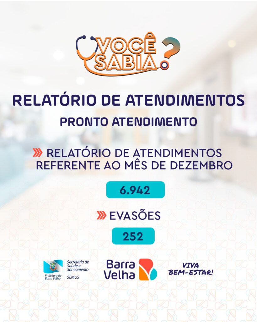 A Secretaria Municipal de Saúde e Saneamento de Barra Velha divulgou que mais de 6,9 mil pessoas foram atendidas no Pronto Atendimento (P.A. 24h), conforme dados fornecidos pela administração do serviço, indicando uma demanda significativa na busca por cuidados médicos.