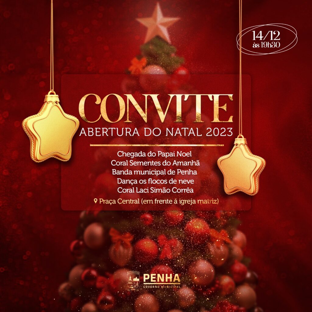 O Papai Noel chega na cidade de Penha nesta quinta-feira (14), para a abertura do Natal 2023. O evento será na Praça Expedicionário Ignácio Ferreira Crispin, em frente à Igreja Matriz, no Centro, a partir das 19h30. A programação é uma idealização da Prefeitura de Penha, NUPHOPE, Acipen, CDL e Núcleo de Turismo, com apoio do Corpo de Bombeiros Militares de Penha.