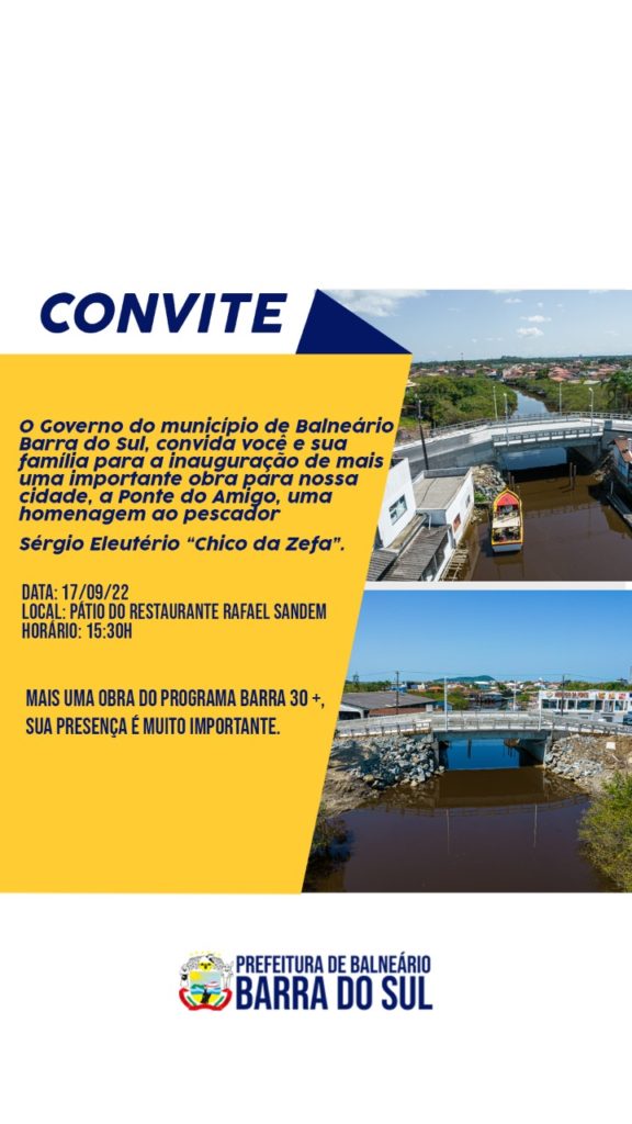 O Governo do município de Balneário Barra do Sul, convida você e sua família para a inauguração de mais uma importante obra para nossa cidade, a Ponte do Amigo, uma homenagem ao pescador Sérgio Eleutério “Chico da Zefa”