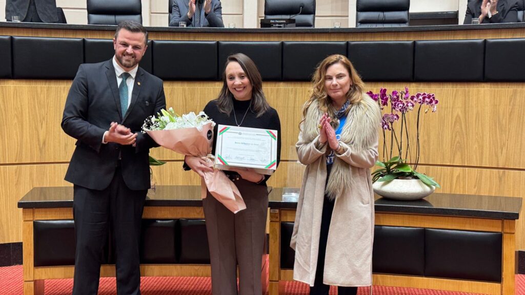 A homenagem reforça a ligação de Renata com Santa Catarina e marca um momento histórico para o Podemos no estado.