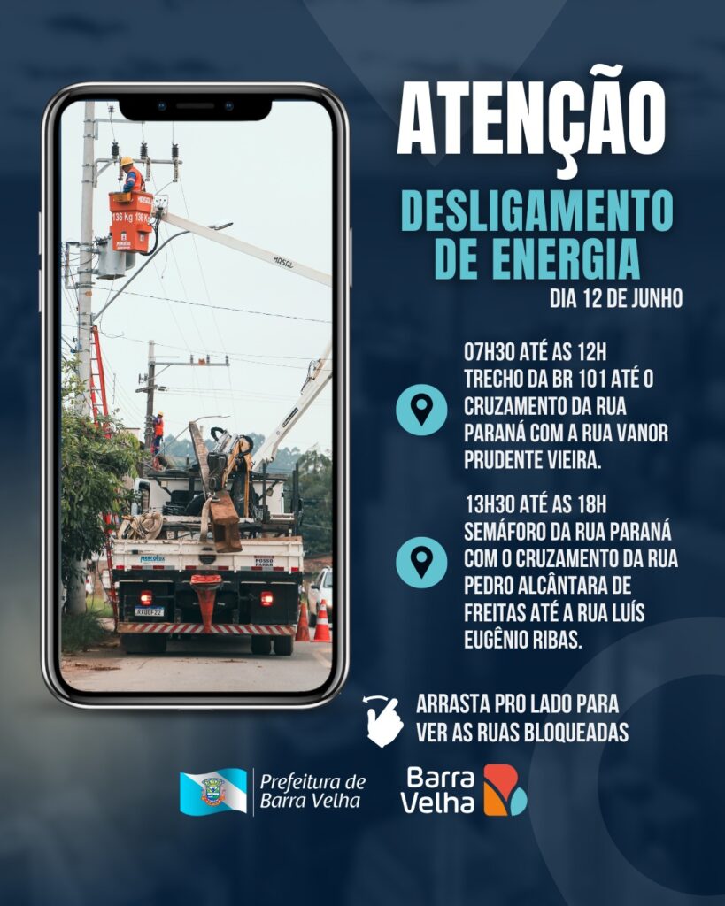 A Prefeitura de Barra Velha informa que na próxima quarta-feira 12/06, haverá um desligamento de energia para a continuação das melhorias na rede de distribuição na Avenida Paraná.