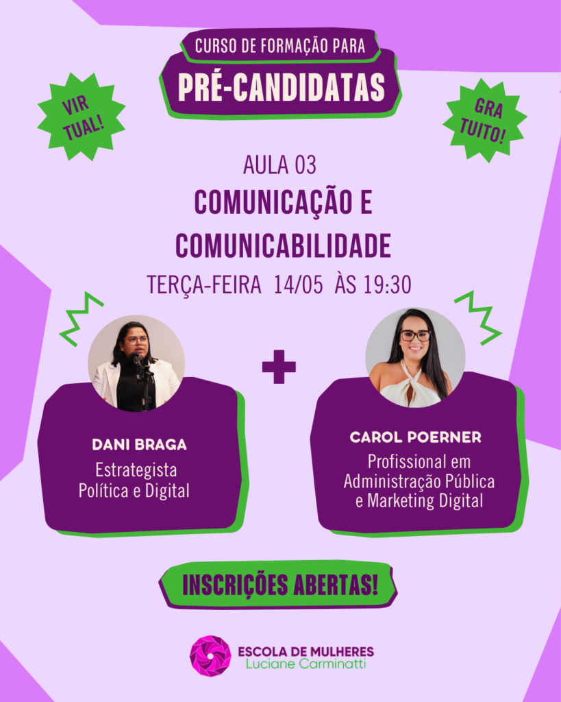 Uma boa comunicação é o coração de uma campanha política. E pode garantir a confiança do eleitor. Mas também é um desafio para quem está chegando agora nas disputas eleitorais. Para dar uma forcinha às pré-candidatas, a Escola de Mulheres oferece aula gratuita e on-line sobre Comunicação e Comunicabilidade.