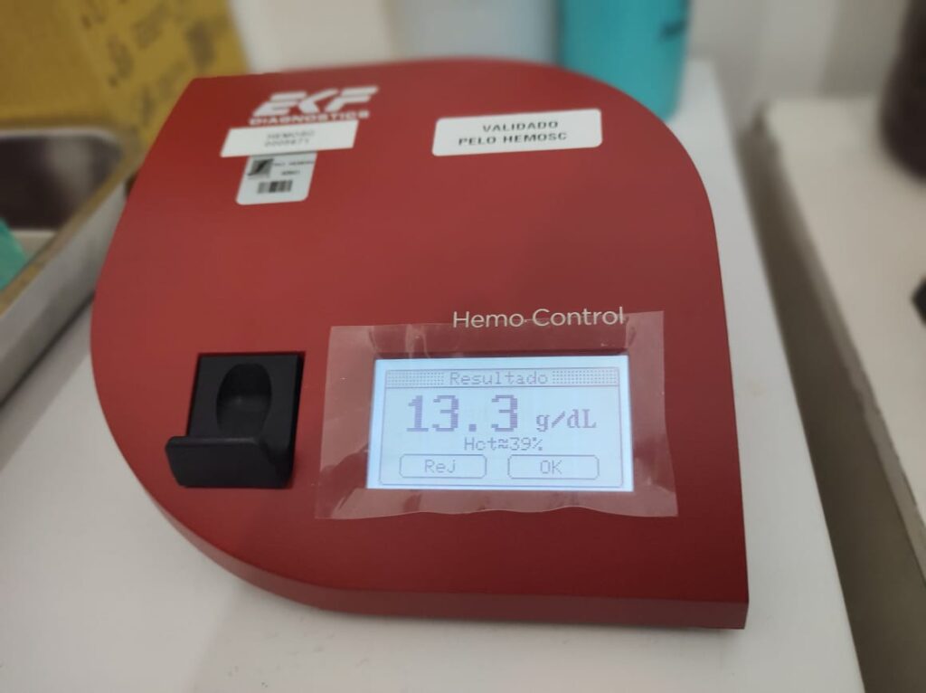 O Hemoglobinômetro analisa os níveis de hemoconcentração no sangue. Após a coleta de uma pequena amostra de sangue do paciente, o material é inserido no aparelho e em poucos segundos já é possível ter o resultado.