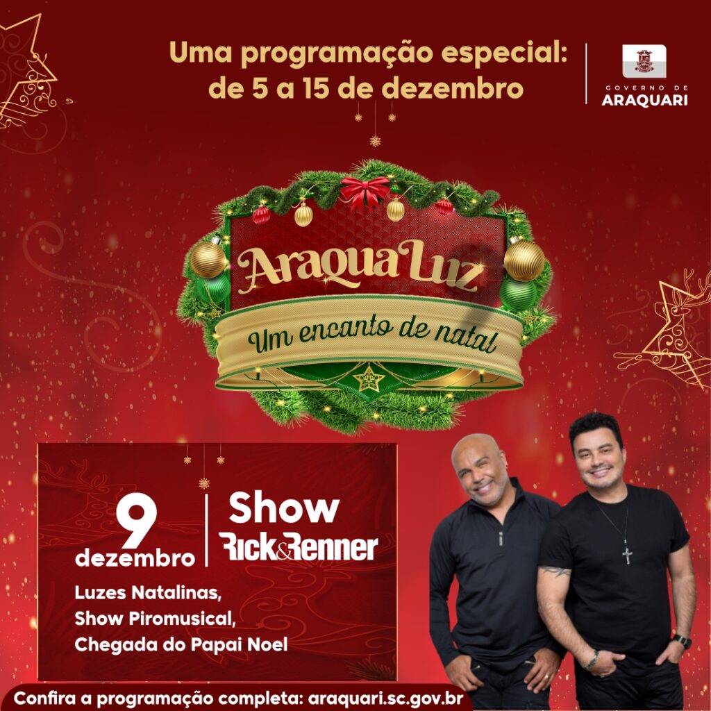 O início de dezembro em Araquari contará com diversas atrações, entre exibições para crianças, shows nacionais e culturais. Os eventos fazem parte da programação do AraquaLuz: um encanto de Natal, que terá início no dia 5 de dezembro e vai até o dia 15. Todas as apresentações são gratuitas.