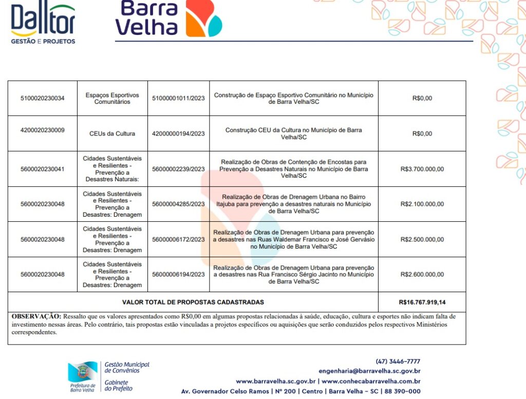 A projeção feita pelo Município aponta ainda a necessidade de obras de drenagens ou contenção de encostas em São Cristóvão e Itajuba, além de captação de recursos para om complexo esportivo e também uma unidade do “Céu da Cultura”, um complexo de cultura com projeto padrão do Governo Federal que Douglas entende ser necessário para a cidade.