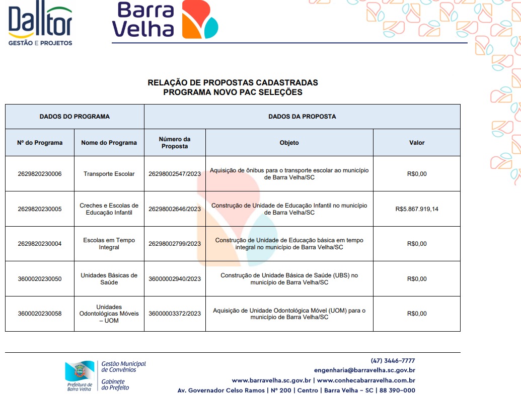 A Administração Municipal cadastrou junto ao PAC um total de R$ 16 milhões e 700 mil em 11 projetos de várias áreas, como educação infantil, escolas em tempo integral, unidades básicas de saúde e gabinetes odontológicos móveis, transporte escolar e obras de drenagem. A projeção foi feita pela consultoria Dalltor Gestão e Projetos, contrata pela Prefeitura.