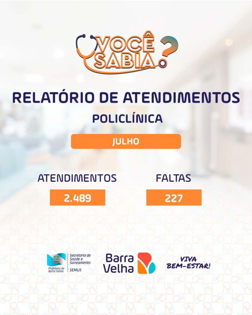 A Secretaria de Saúde e Saneamento da Prefeitura de Barra Velha divulga para a população, nesta quarta-feira (09/08), o Relatório de Atendimento da Policlínica, correspondente ao mês de julho de 2023.