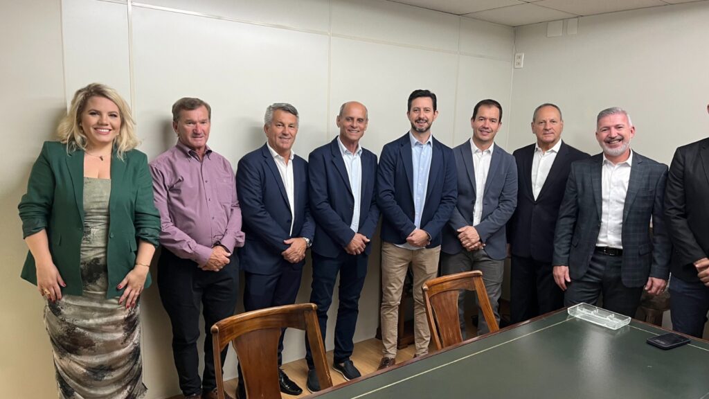 Da direita para esquerda: Clenilton Pereira- Prefeito de Araquari, Londry Turra – secretário de Governo, Comunicação e Desenvolvimento de Araquari, Nelson Silveira- vereador, Sidinei Xavier – presidente da Câmara de Vereadores de Araquari, Erico de Oliveira- Presidente AMFRI (Associação dos Municípios da Região da Foz do Rio Itajaí), Ademar Borges – diretor da AMFRI, Alcidir Boaretto – empresário, Ana Paula Damázio- secretária Adj de Governo, Comunicação e Desenvolvimento.