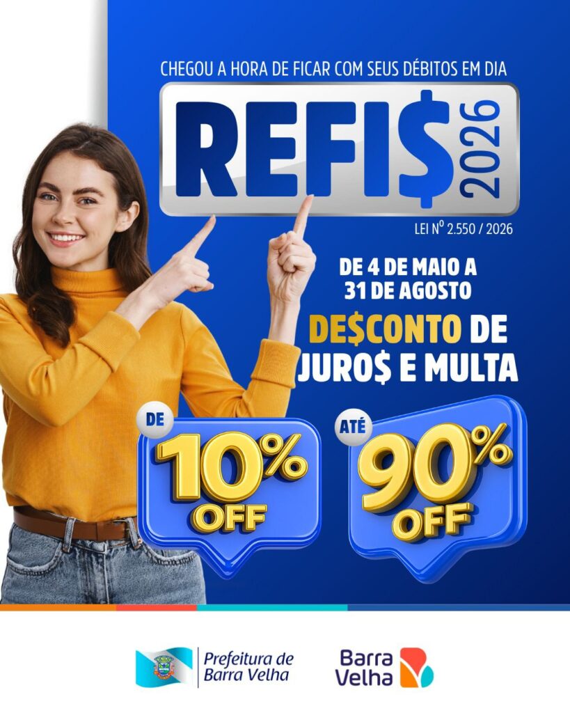 O Programa de Recuperação Fiscal (REFIS) de Barra Velha, instituido pela Lei nº 2.550, de 1º de abril de 2026, é destinado a contribuintes com débitos, inscritos ou não em dívida ativa, vencidos até 31 de dezembro de 2025, incluindo aqueles já ajuizados e tributos não pagos ou declarados.