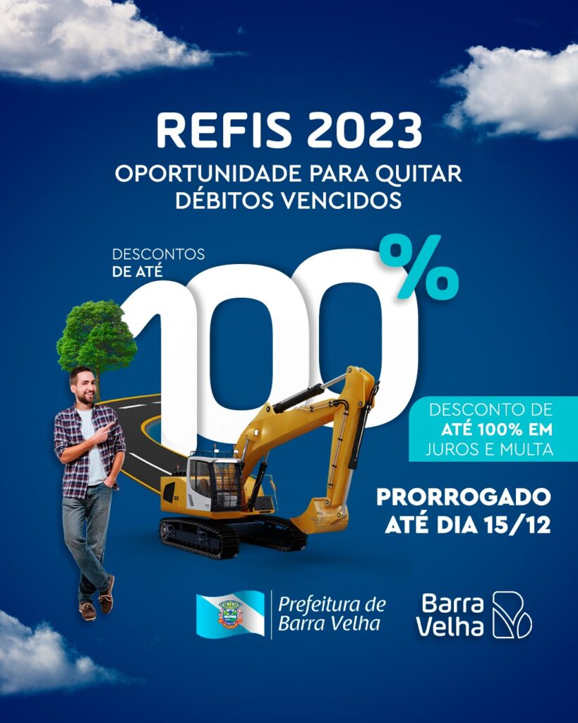 A Prefeitura de Barra Velha, por meio da Secretaria de Finanças, anunciou a prorrogação do prazo para adesão ao Programa de Recuperação Fiscal (REFIS) até 15 de dezembro. O programa tem como objetivo oferecer aos cidadãos a oportunidade de regularizar seus débitos junto ao Município, sejam eles constituídos ou não, com fato gerador até 31 de dezembro de 2022.