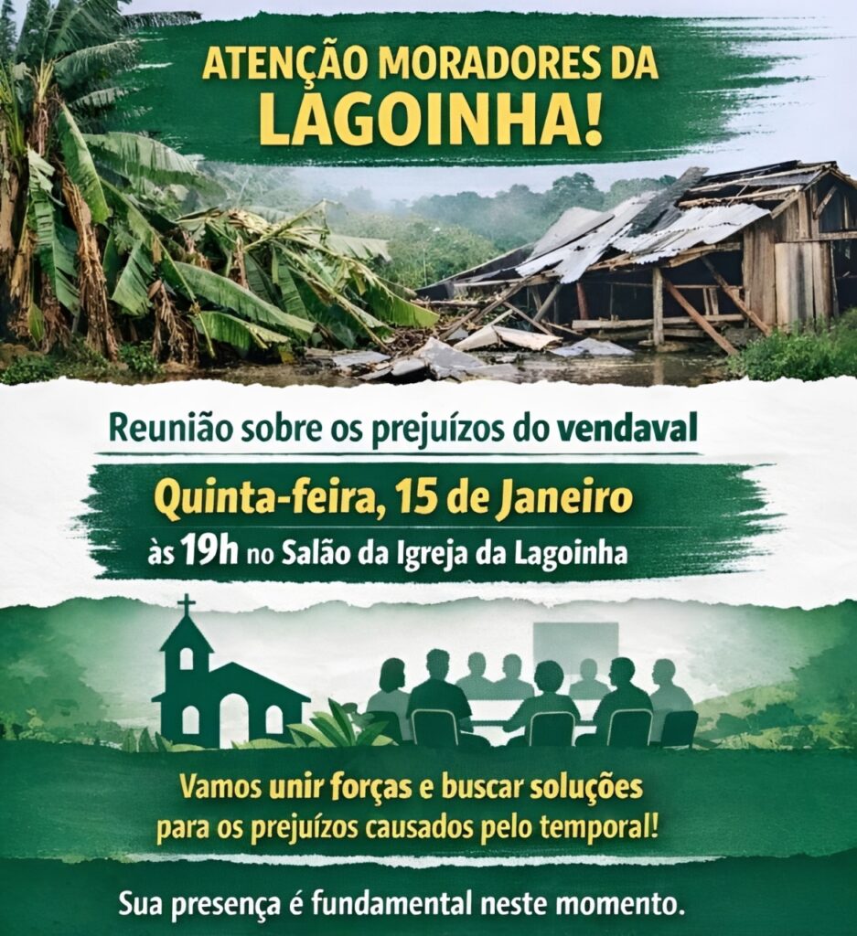 A Prefeitura de São João do Itaperiú realiza, nesta quinta-feira (15), às 19h, no salão da Igreja da Lagoinha, uma reunião aberta à comunidade para articular apoio aos produtores rurais e moradores atingidos pelo vendaval registrado no último domingo (11).