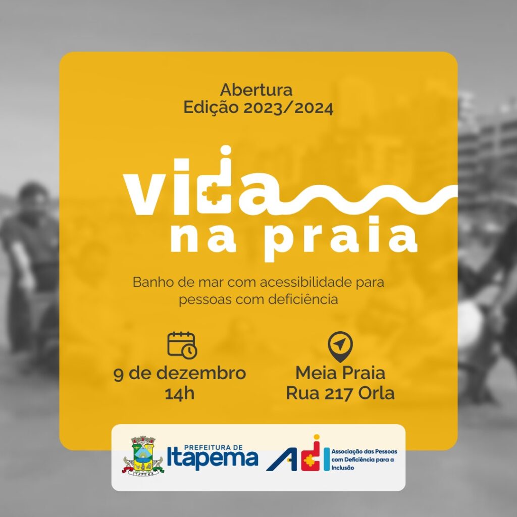 As atividades do Projeto Vida na Praia retornam ao litoral catarinense a partir deste sábado, 9 de dezembro, às 14h, em dois pontos da cidade. Esta é a 12ª edição da iniciativa que promove a inclusão de pessoas com deficiência ou mobilidade reduzida em cadeiras anfíbias adaptadas, e é realizada pela Associação das Pessoas com Deficiência para a Inclusão (ADI) em parceria com a Prefeitura de Itapema (SC).