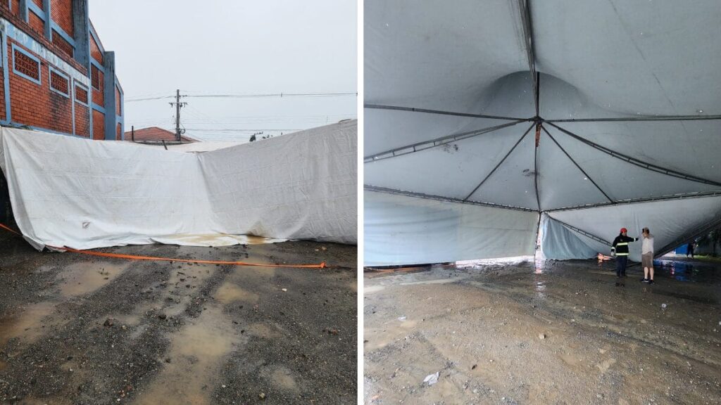Ao menos cinco crianças ficaram feridas após a queda de uma tenda em Barra Velha por conta das chuvas que atingem Santa Catarina neste sábado (7). Todas são estudantes da rede municipal de ensino de Blumenau e aguardavam para se apresentar na Copa de Bandas e Fanfarras que ocorre na cidade durante este fim de semana. Os alunos tiveram de ser encaminhados ao hospital, mas sofreram apenas ferimentos leves, informou a prefeitura de Blumenau.
