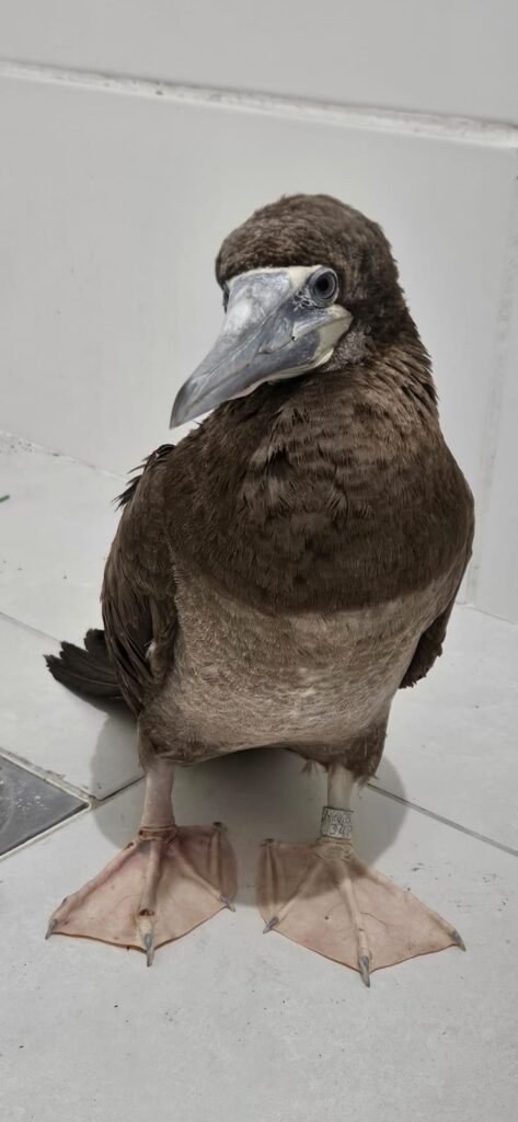 A ave resgatada trata-se de um Atobá Pardo (Sula leucogaster), espécie comum na costa. Um detalhe importante é que o animal já possuía uma anilha de identificação, o que indica que já havia sido acolhido anteriormente por alguma equipe técnica especializada — o que reforça a importância do monitoramento e da reabilitação da fauna silvestre no território.