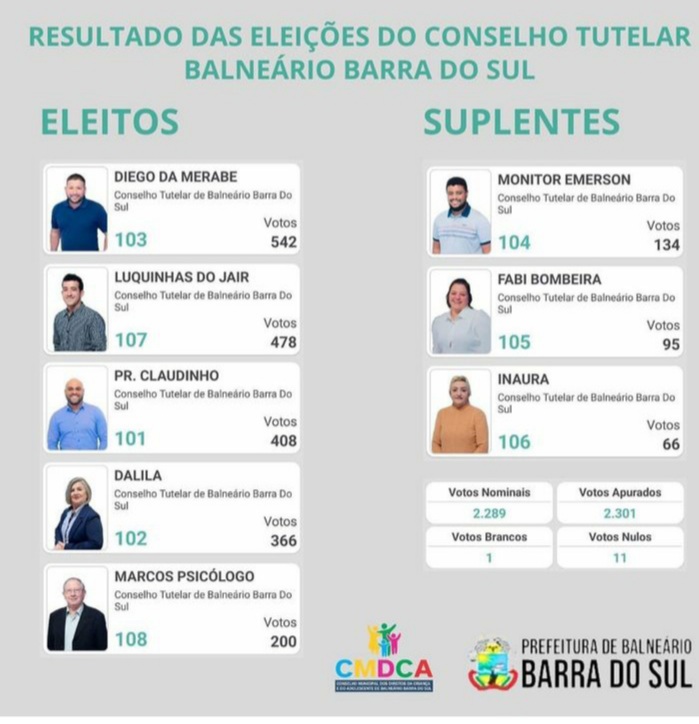 A Prefeitura de Penha, por meio da Secretaria de Assistência Social, e o Conselho Municipal dos Direitos da Criança e do Adolescente, divulga oficialmente neste domingo (01/10) o resultado da Eleição para o Conselho Tutelar de Penha. Ao todo, 1.231 eleitores foram às urnas em Penha e elegeram os cinco conselheiros tutelares titulares que serão empossados no dia 10 de janeiro de 2024, para um mandato de quatro anos.