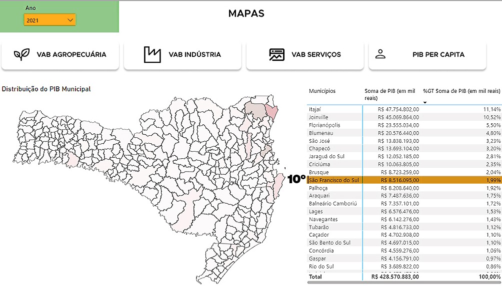 A economia de São Francisco do Sul cresceu e é a 10ª de Santa Catarina. É o que comprovam os dados do Produto Interno Bruto (PIB) divulgados pelo Instituto Brasileiro de Geografia e Estatística (IBGE) na sexta-feira (15). O município do Norte do Estado cresceu cinco posições no ranking de 2021 em comparação ao ano anterior.
