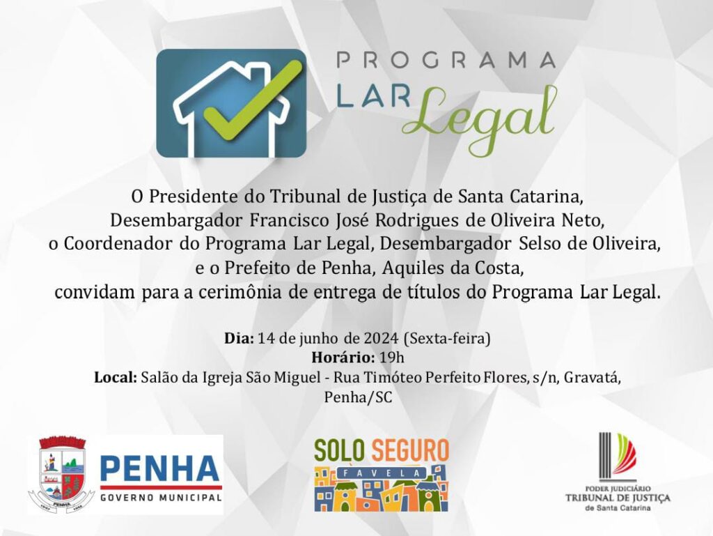 O Tribunal de Justiça de Santa Catarina (TJSC) e a Prefeitura de Penha realizam na noite desta sexta-feira (14/06) a entrega de 151 títulos de propriedade através do Programa Lar Legal. As famílias beneficiadas nesta etapa residem nos bairros Gravatá, Santa Lídia, Nossa Senhora de Fátima e São Cristóvão, e na localidade do Mariscal. O evento será a partir das 19h no Salão da Igreja de São Miguel, no Gravatá.