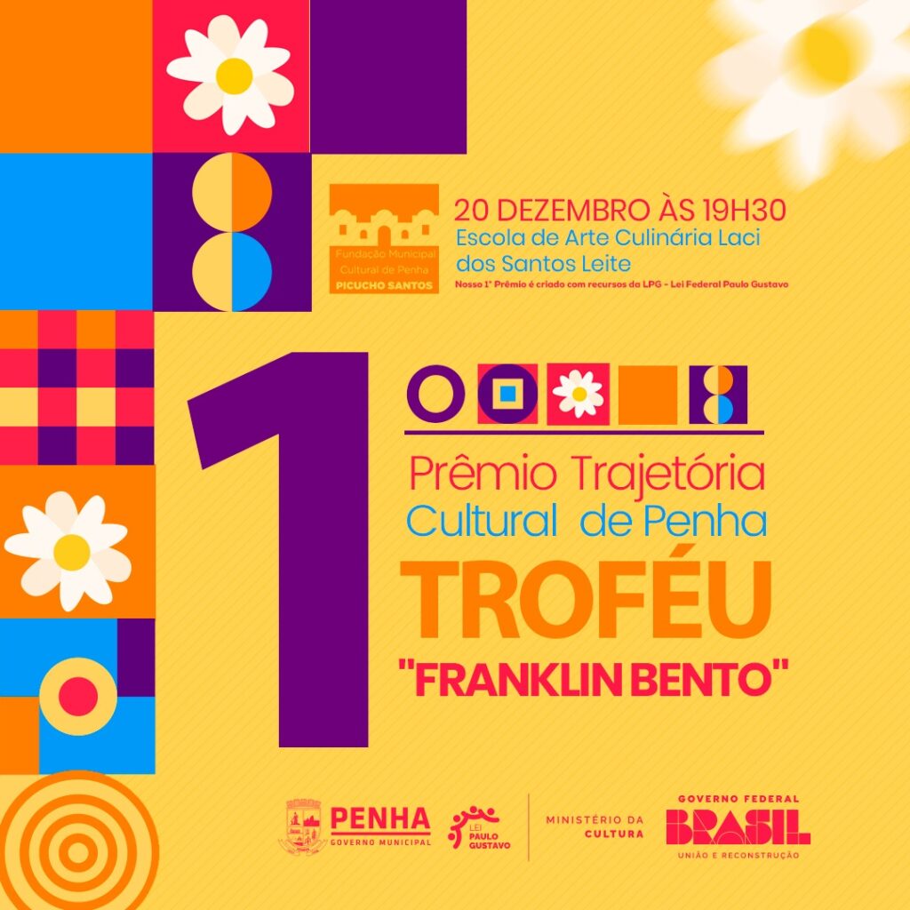 A Prefeitura Municipal de Penha, por meio da Fundação Cultural Picucho Santos, promove o 1º Prêmio Trajetória Cultural de Penha, o “Troféu “Franklin Bento”, nesta quarta-feira (20). A iniciativa irá premiar 39 fazedores de cultura que se inscreveram no Edital Trajetória Cultural, aplicado com os recursos da Lei Paulo Gustavo, e que comprovaram histórico nas artes e na cultura. O evento será a partir das 19h30, na Escola de Arte Culinária Laci dos Santos Leite.